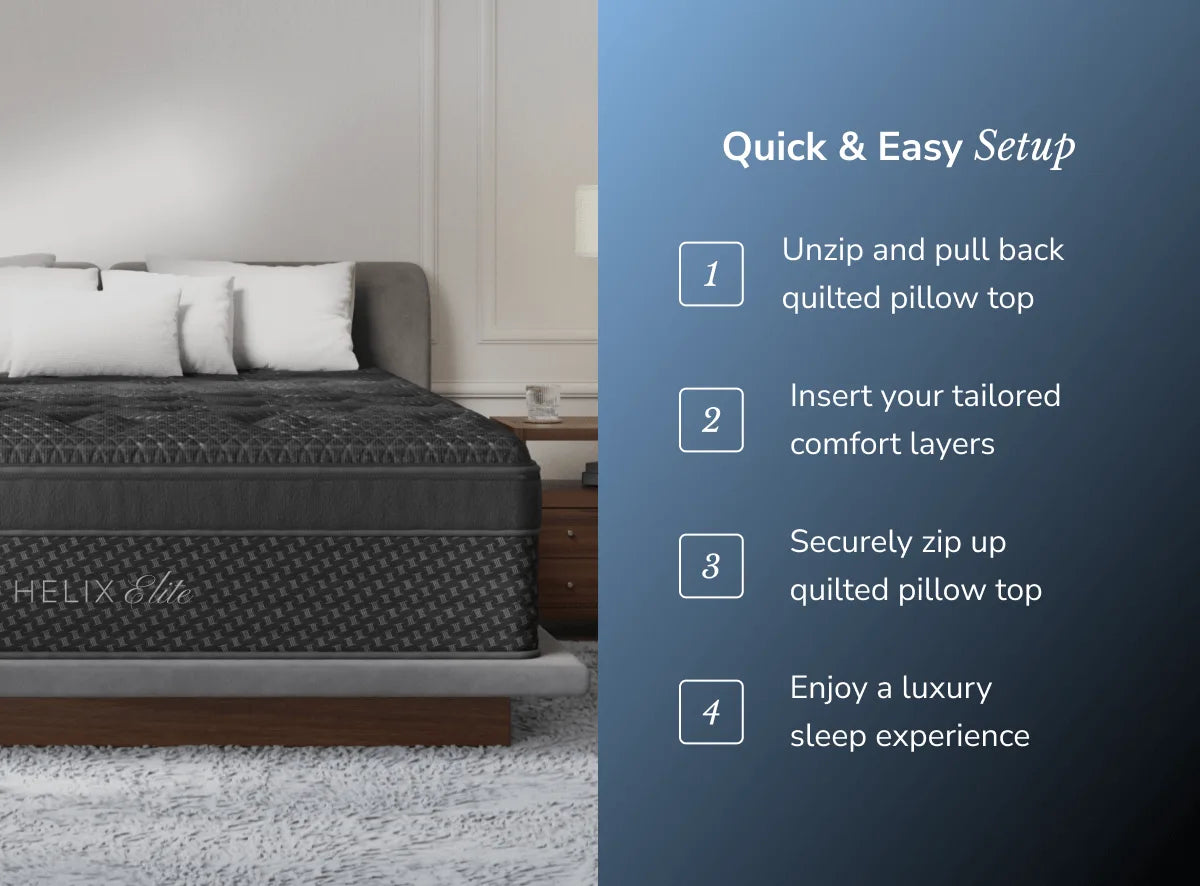 At Helix, our mission is to create a personalized sleep experience for everyone. The Helix Elite Collection is a testament to our innovative style, seamlessly blending high-end luxury with customized comfort. Each Helix Elite mattress is meticulously handcrafted to provide an exceptional sleep experience tailored to your needs.